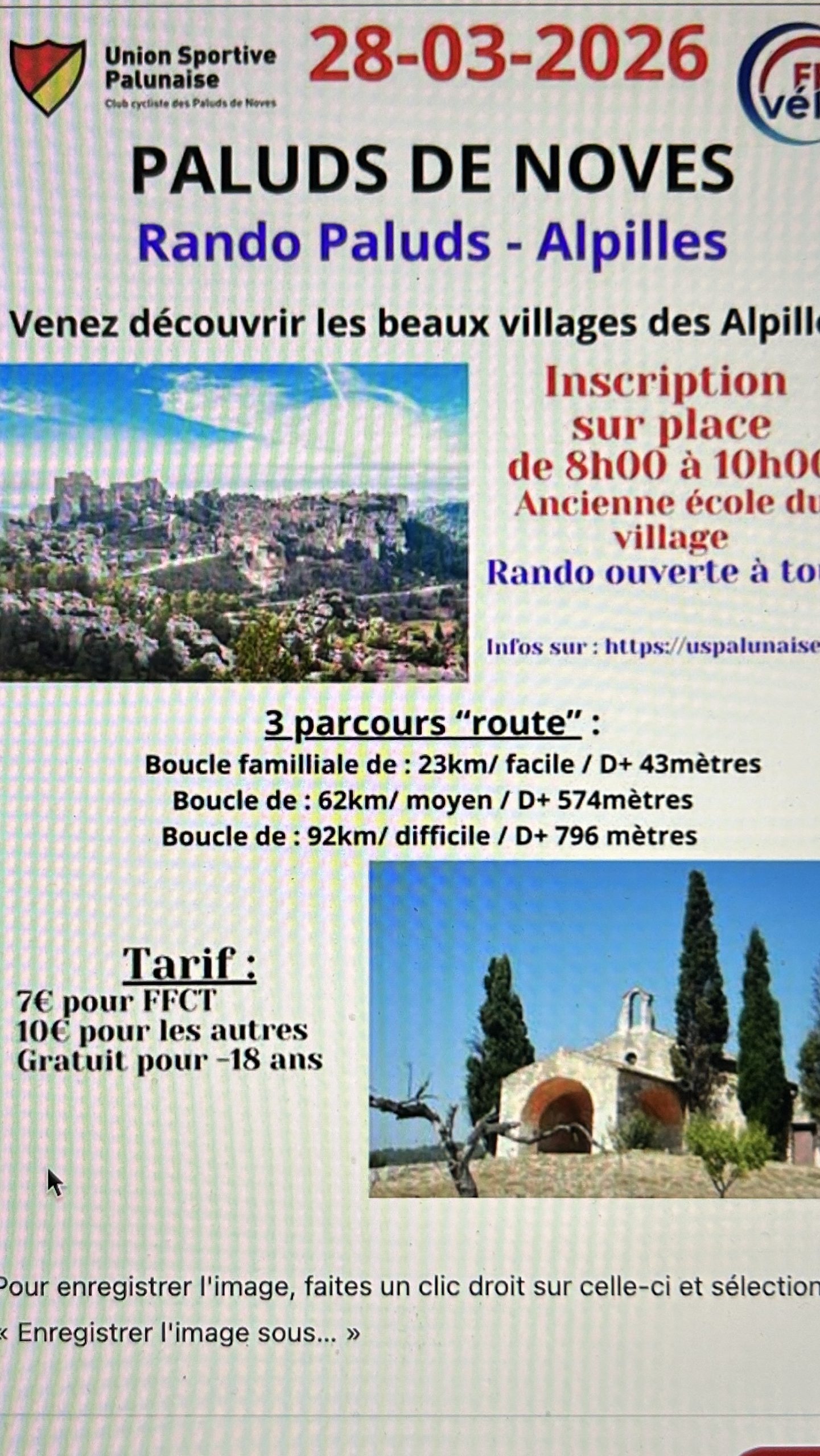 Inscription sur place de 8h00 à 10h00 ancienne école du village des Paluds de Noves. 2 circuits 62 et 92km dans les Alpilles . Départ du boulodrome en voiture à 7h30